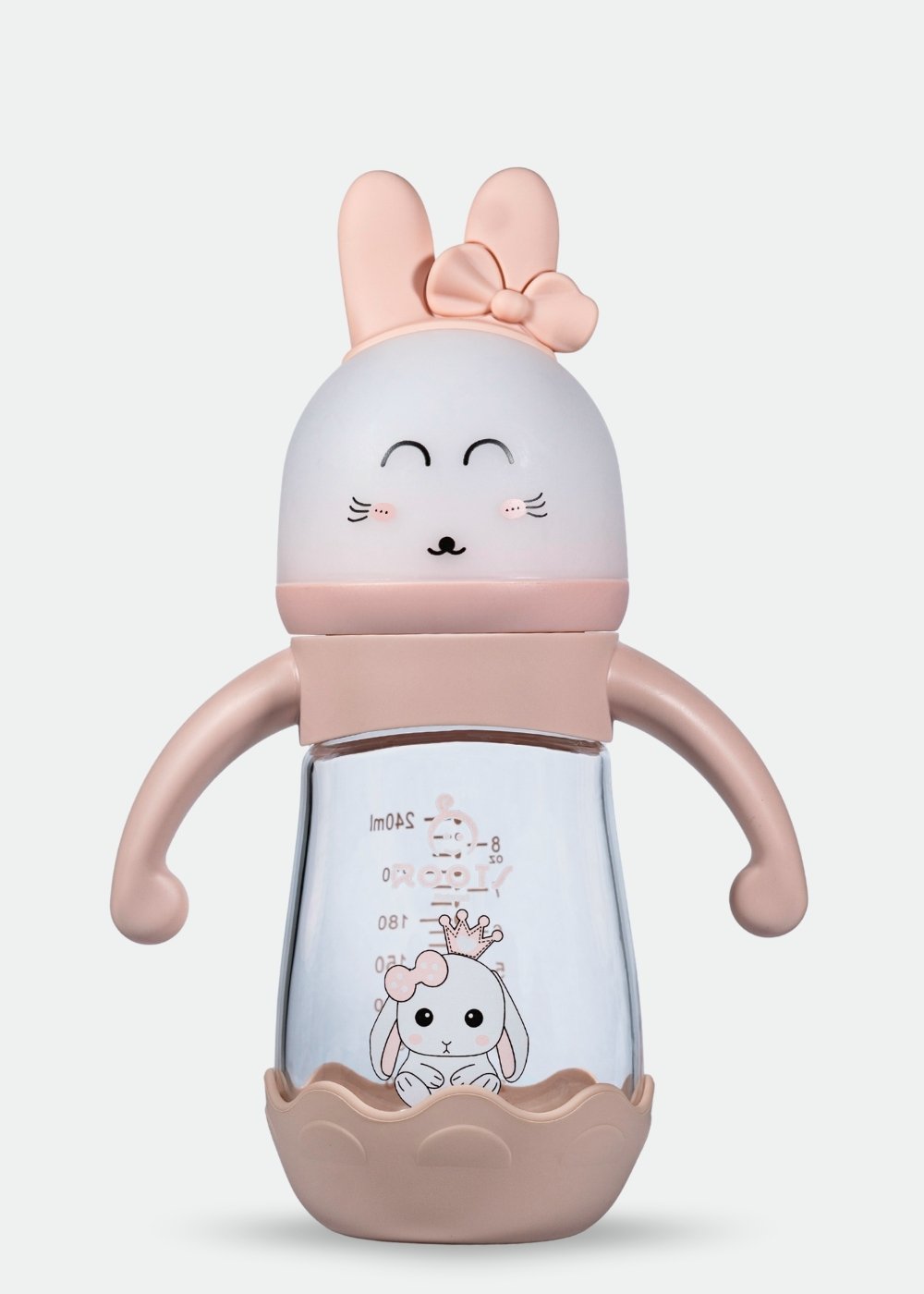 M05-Pink Glass Bottle: 240ML/8 OZ Capacity with Soft Handle and Protective Base – Pink bow
